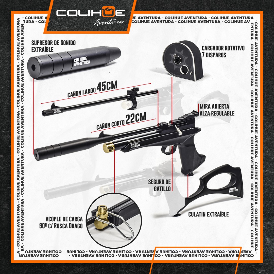 Ademas incluye de fabrica un moderador de sonido , y un cargador de 7 disparos, redondeando un producto muy completo y funcional.