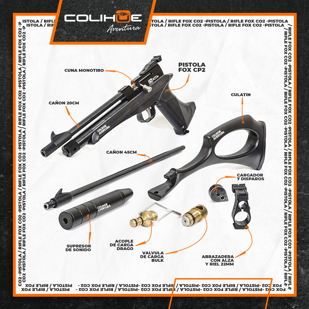 Fox diseño una pistola Co2 que puede convertirse en rifle en pocos pasos en un rifle, pues la pistola viene con dos cañones, uno de 22cm (para la pistola), y el otro de 45cm para convertirlo en rifle, ademas incorpora un culatin adaptable para terminar de dar forma el rifle! Una increible propuesta, la Fox Cp2