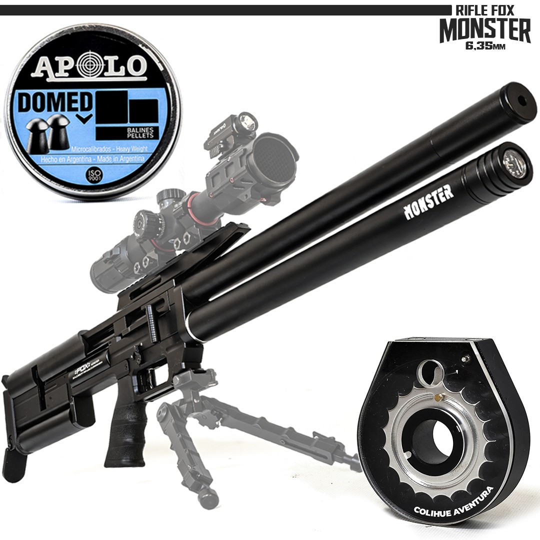El Fox Monster calibre 6.35mm es un rifle PCP (Pre-Charged Pneumatic) diseñado para ofrecer una combinación excepcional de potencia, autonomía y funcionalidad, ideal para la caza.