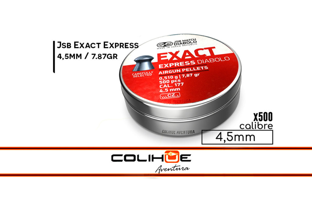 Especificaciones Tecnicas: Calibre 4,5mm – .177 Modelo Exact Express Peso (grains) 7.87 grains Peso (gramos) 0.510 gramos Longitud 5 mm Potencia de Rifle (en disparo a 1000 fps) 23.698 Joules Potencia de Rifle (en disparo a 850 fps) 17.122 Joules Rango de velocidad – Material plomo Presentacion Envase Metalico por 250u.