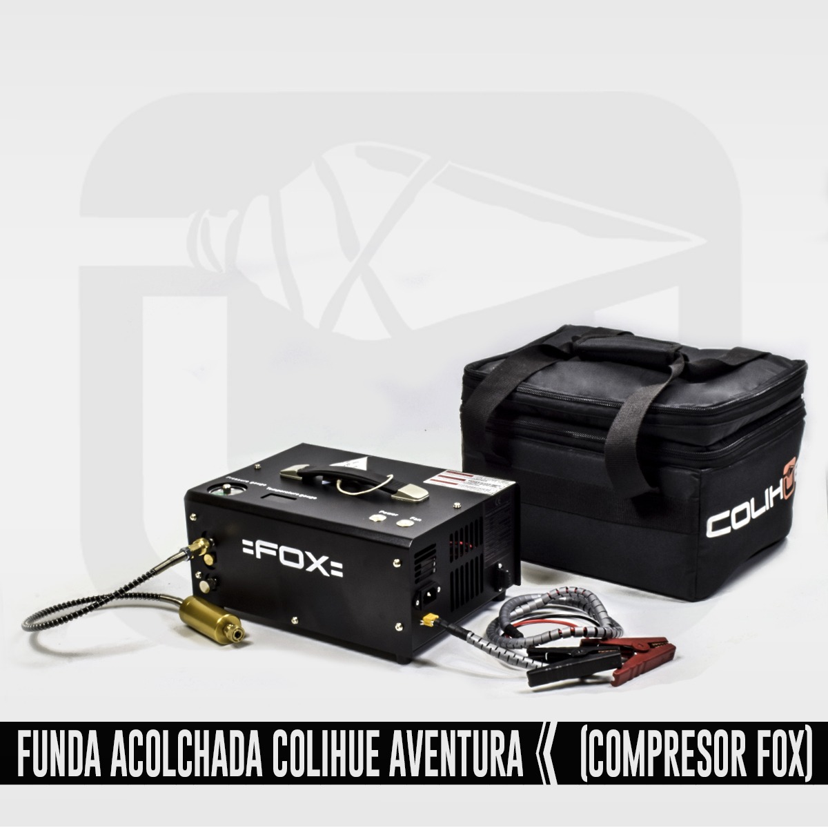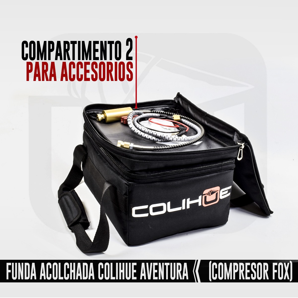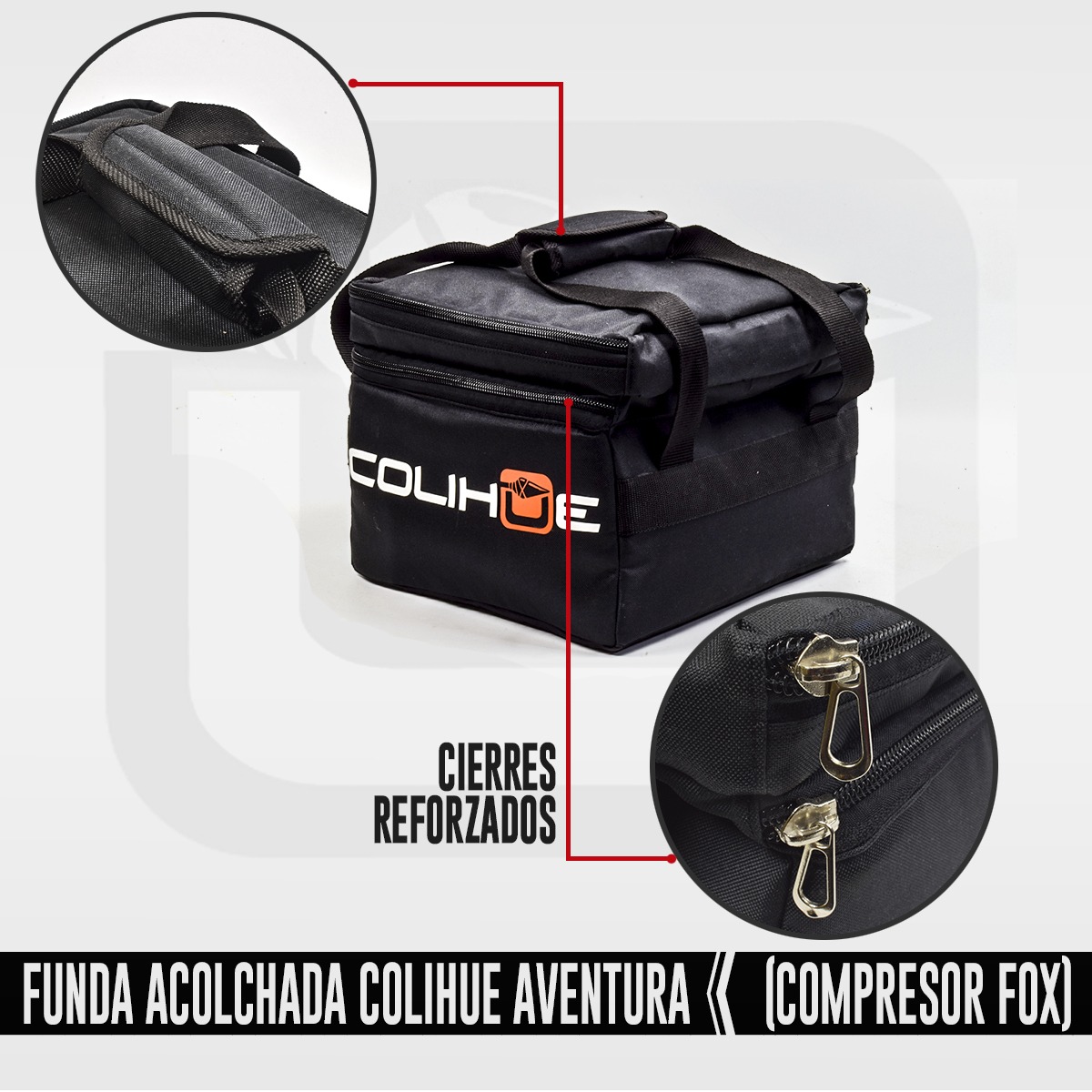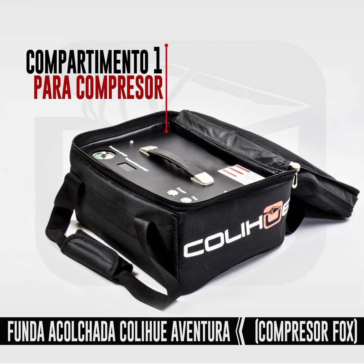 Fabricada en cordura en su exterior y cuero ecológico en su interior… fabricada a medida del compresor fox, modelo de 12 y 220 volts… con un primer compartimento donde colocaremos el compresor… y un segundo compartimento donde iran colocada la manguera, los cables de conexion, acoples, etc.!!