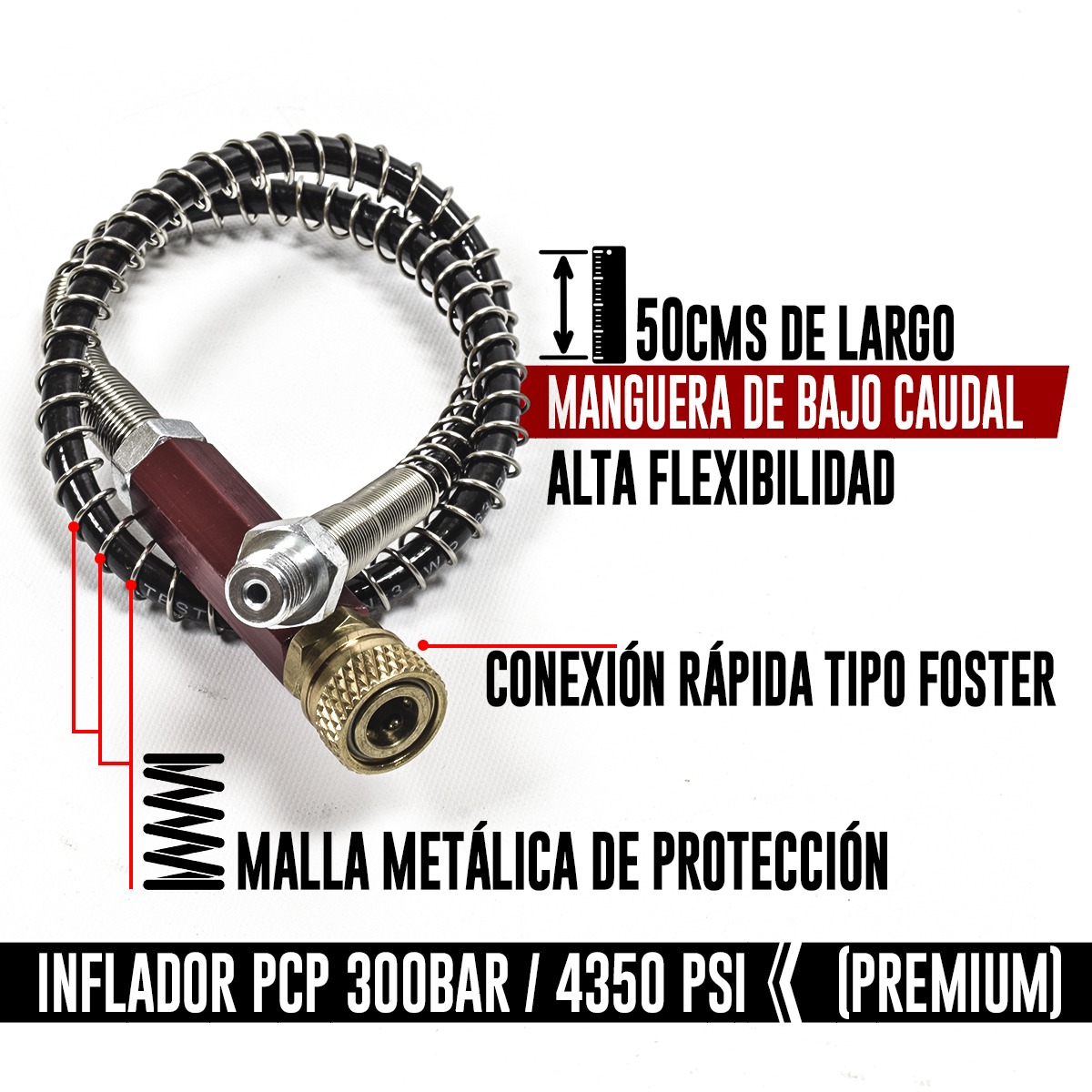 Diseñado para ofrecer el mejor rendimiento, incluye una manguera de 50cms, de bajo caudal, que ayuda a que la presión ingrese de manera mas directa al rifle, inflando mas rápido y reduciendo el esfuerzo.. Además la manguera es ultra-flexible y tiene una malla metálica de protección…