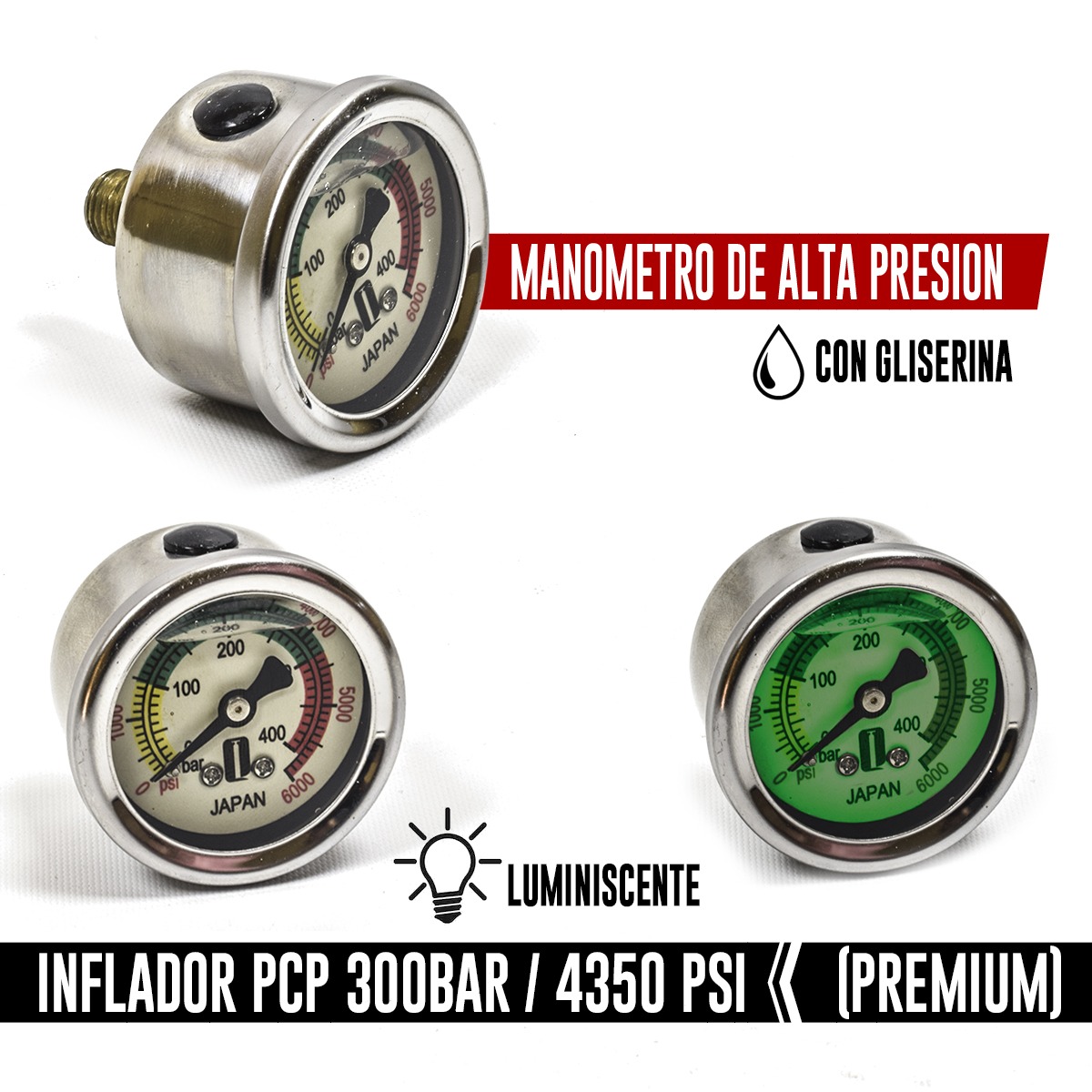 El inflador incorpora un manómetro de alta presión con gliserina para evitar las variaciones, además pensado para cazadores.. el manómetro esta fabricado con materiales luminiscentes, para poder ver la carga incluso en condiciones de escasa luz…