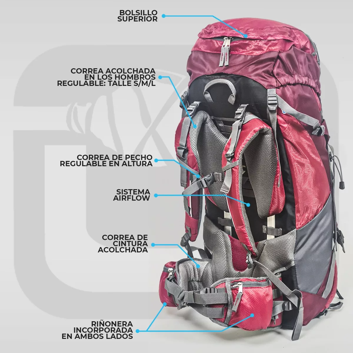 Correas externas: muy necesarias a la hora de portear crampones, piolets, aislantes, bastones de trekking, un abrigo… – Bolsillos exteriores: allí se estibará el equipo adicional de rápido acceso: GPS, cámara de fotos, celular, barritas energéticas, botiquín, mapas. – Bolsillos del tipo riñonera en el cinturón.