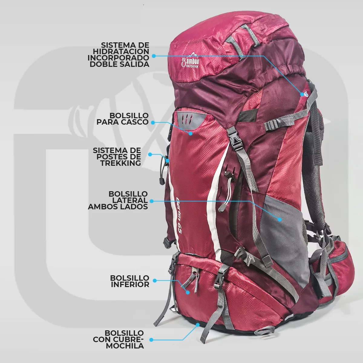 Esta mochila tiene capacidad de 65 Litros, con posibilidades de extenderla hasta 70lts gracias a su sistema de cumbrera . Es ideal para travesias largas; una de las principales caracteristicas es el sistema de sujecion ya que adaptar la mochila a nuestra espalda es fundamental, y en eso no solo influye la correcta distribución del peso, sino la elección y ajuste del espaldar a nuestra talla.
