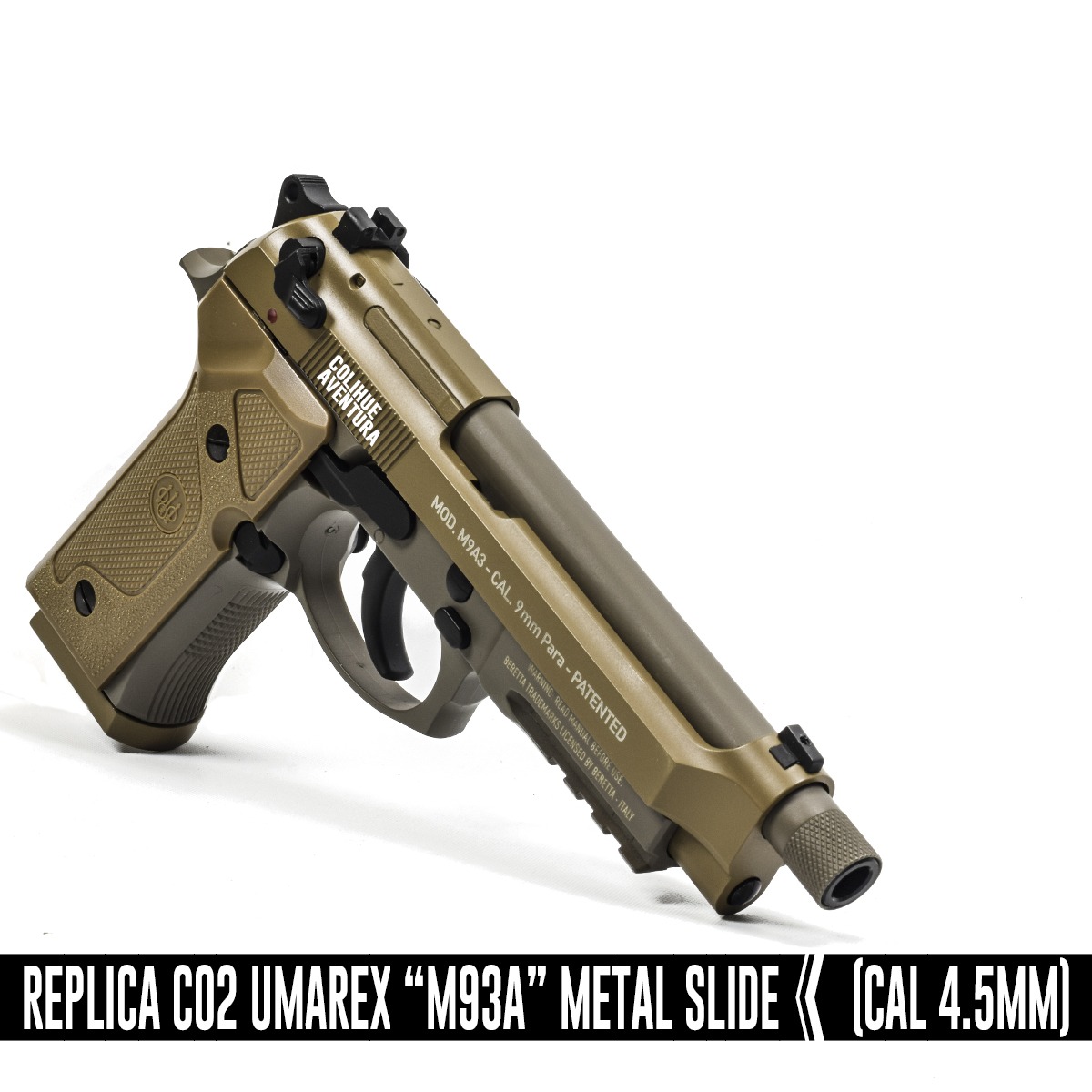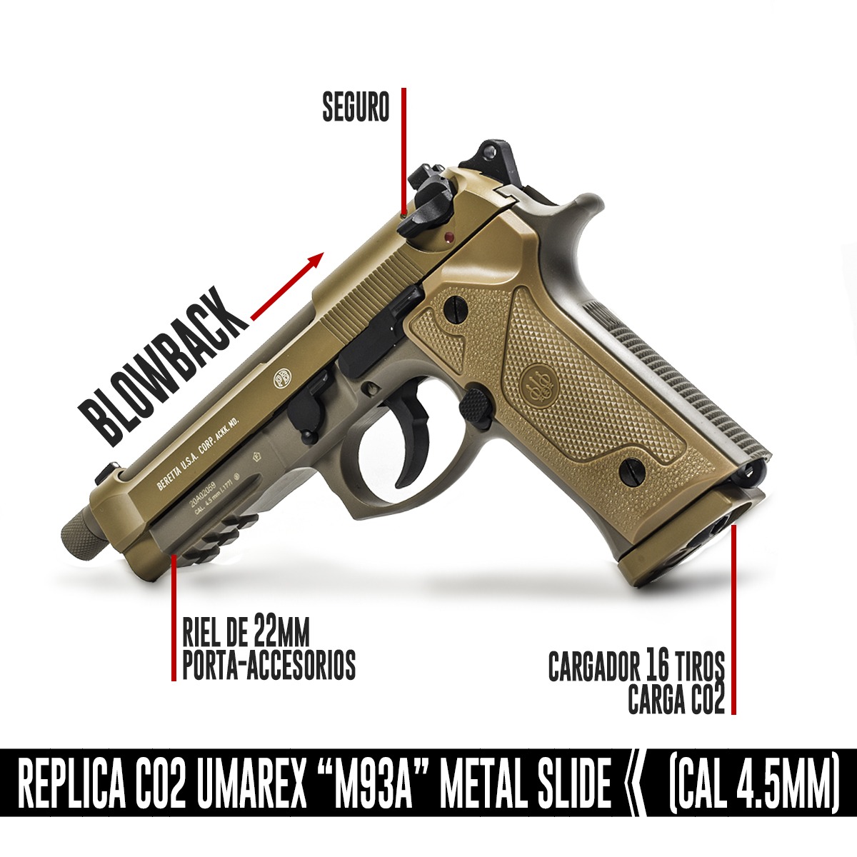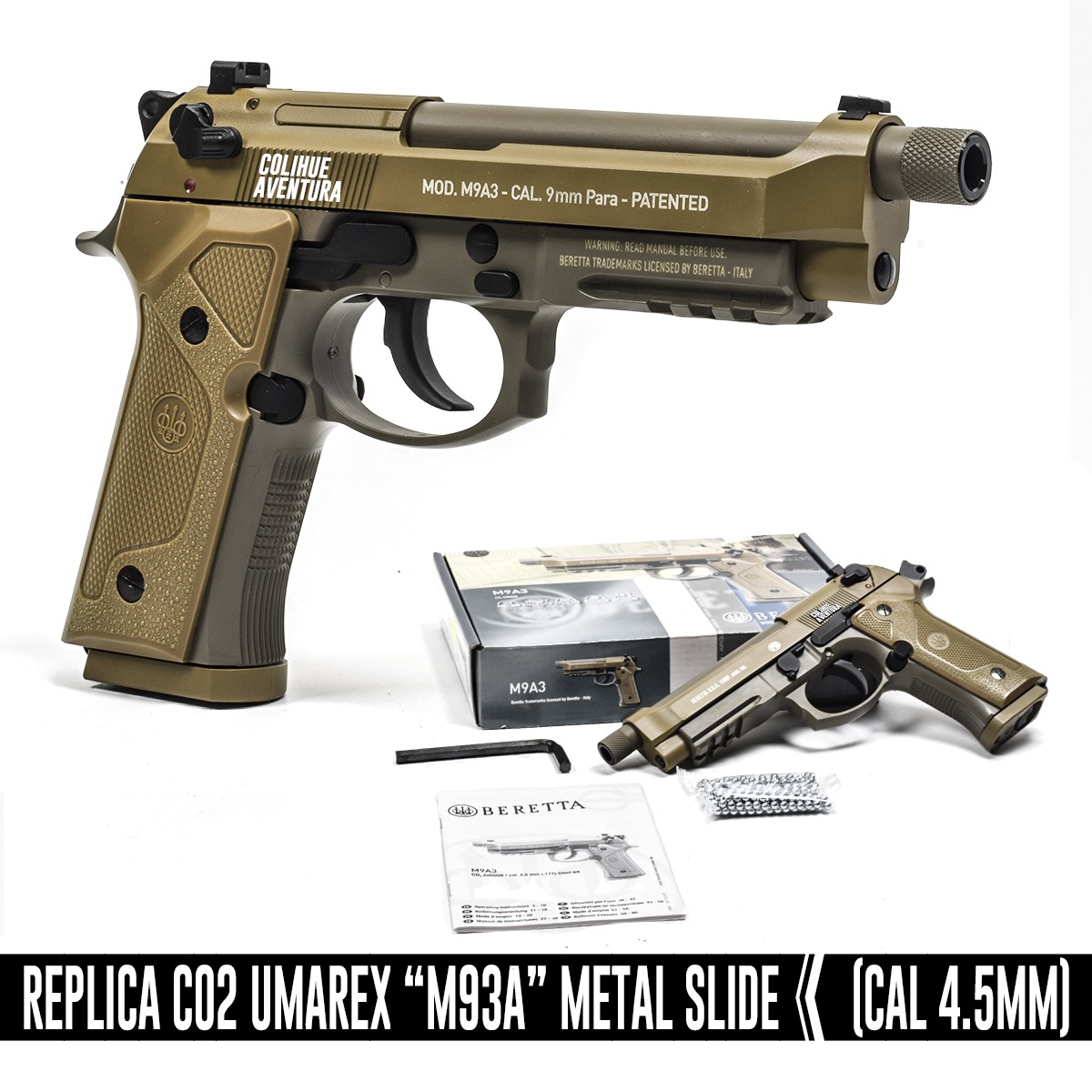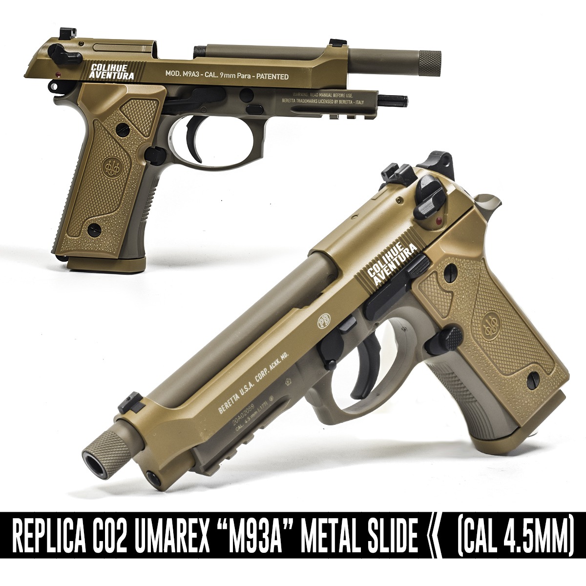 La Umarex M9A3 es una replica de la tan reconocida Beretta 92… En este caso con un diseño Militar Desértico, con la corredera metalica, con accion BlowBack!…