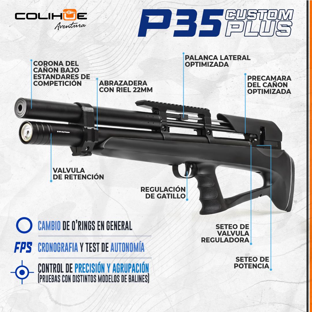 El P35 Plus es un rifle regulado, es decir que tiene un dispositivo (válvula reguladora) que limita la presión de cada disparo, de esta manera el rifle estaría usando la misma presión en todos los tiros hasta que la presión del deposito de aire iguale la presión de la válvula reguladora que generalmente es de 150bar…
